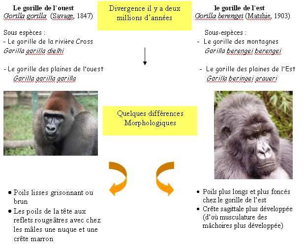 Il existe 2 espèces de gorille, chacune de ces espèces comprenant deux sous-espèces :